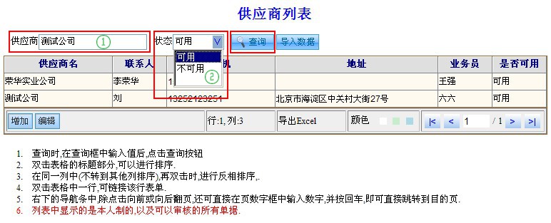 在办公系统下,点击“OA系统设置”--“基础设置”--“供应商主页列表”菜单,进入供应商列表界面,可以进行增加、编辑、查询和Excel导入。具体操作说明事项如下: |