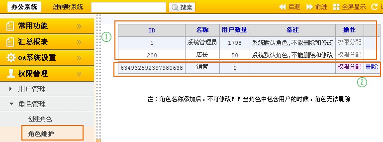 在办公系统下,点击“权限管理”--“角色管理”菜单,点击“创建角色”完成新增角色;点击“角色维护”完成对新增的角色分配权限。具体操作说明事项如下: |