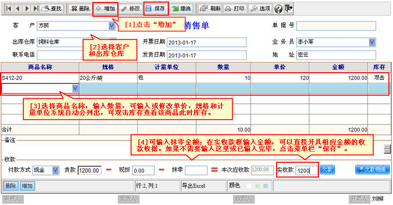 (1)您可以在销售单界面,点击菜单栏的“增加”按钮,进入销售开票界面。打开图示帮助 视频演示