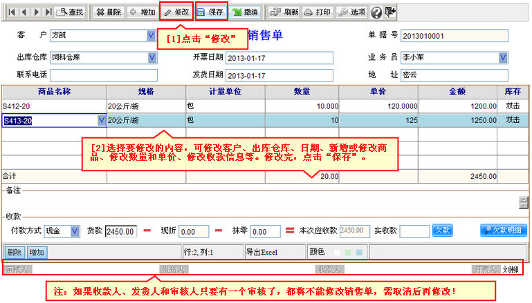 (1)修改销售单:您查找到要修改的销售单后,在菜单栏点击“修改”,修改相关内容,点击“保存”。打开图示帮助 视频演示