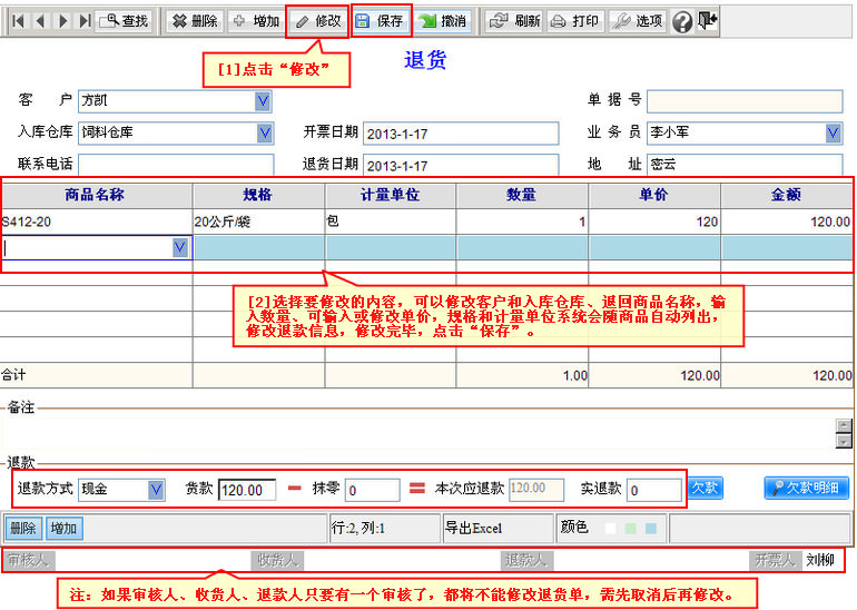 (1)修改退货单:您查找到要修改的退货单后,在菜单栏点击“修改”,修改相关内容,点击“保存”。打开图示帮助 视频演示