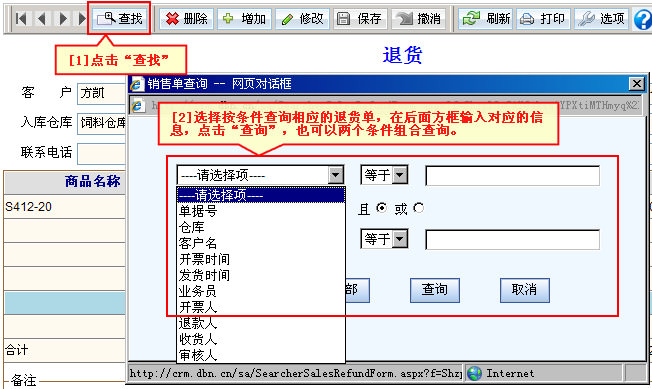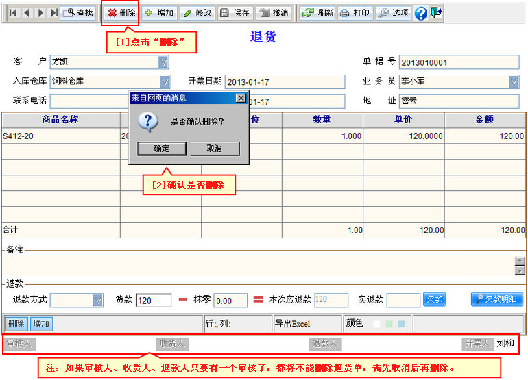 (2)删除退货单:您查找到要删除的退货单后,在菜单栏点击“删除”。打开图示帮助 视频演示