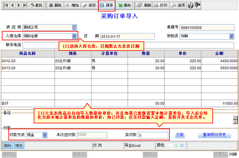 (2)大北农采购导入的采购单可以修改仓库,点击仓库下拉框旁边的图标,重新选择仓库,点击“保存”。
