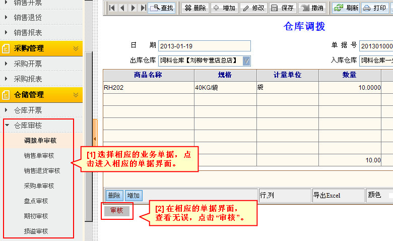 仓库审核 当发生销售或采购业务时,仓库完成收发货后需及时审核,防止业务数据更改,保证数据的准确性。主要有销售单审核,采购单审核,调拨单审核,盘点审核等。在进销财系统下,点击“仓储管理”--“仓库审核”菜单下,选择业务单据审核,进入相应的界面进行仓库审核。