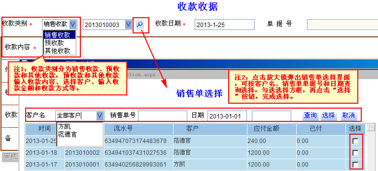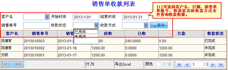 (2)您也可以在收款列表界面选择条件点击“查找”。打开图示帮助 视频演示