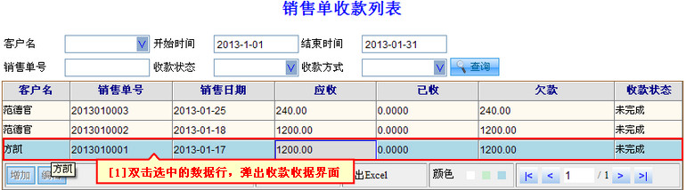 (2)您可以在收款列表界面,双击未完成数据行弹出收款收据界面。打开图示帮助 视频演示
