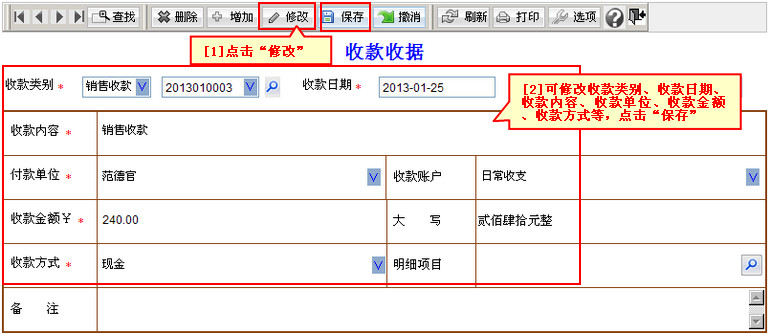 (1)修改收款收据:您查找到要修改的收款收据后,在菜单栏点击“修改”,修改相关内容,点击“保存”。打开图示帮助 视频演示