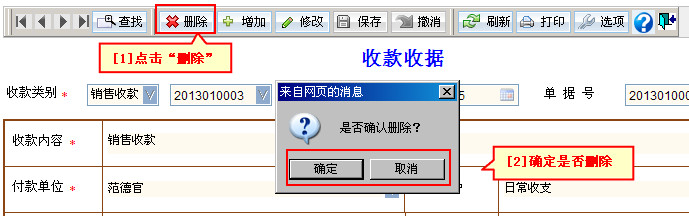 (2)删除收款收据:您查找到要删除的收款收据后,在菜单栏点击“删除”。打开图示帮助 视频演示