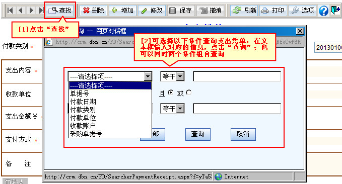 您可以在菜单栏点击“查找”,弹出选择查询条件页面,选择输入查询条件。打开图示帮助 视频演示