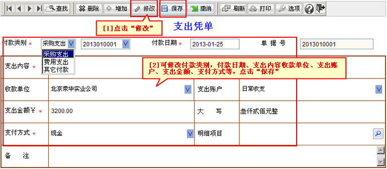 (1)修改支出凭单:您查找到要修改的支出凭单后,在菜单栏点击“修改”,修改相关内容,点击“保存”。打开图示帮助 视频演示