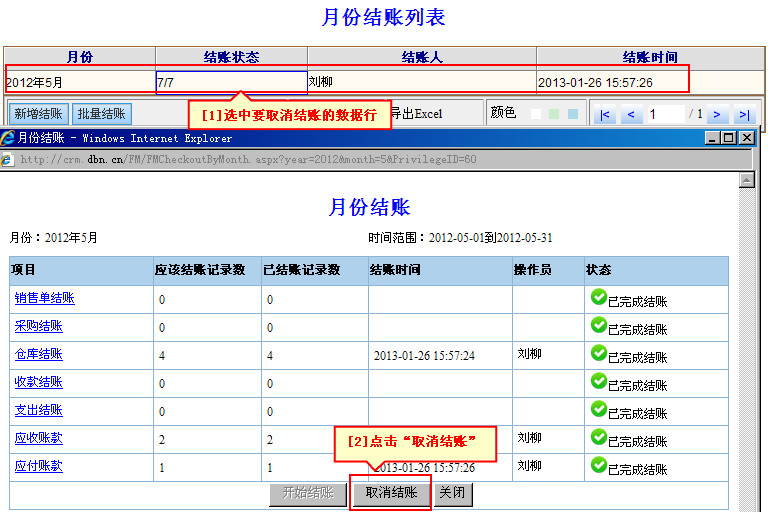 您可以在列表下选中要取消结账月份,双击弹出结账页面,点击“取消结账”。注意:只能从最近结账月份开始取消,不能跨月取消。打开图示帮助 视频演示