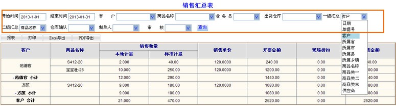 销售汇总表 可查看到与销售有关的汇总信息,默认为当月的销售汇总信息,可以通过按日期、客户、商品名称、业务员、出货仓库、一级汇总、二级汇总、仓库确认、制单人和审核等条件查询。在进销财系统下,点击“销售管理”--“销售报表”--“销售汇总表”菜单,可查看报表、打印、Excel和PDF导出。