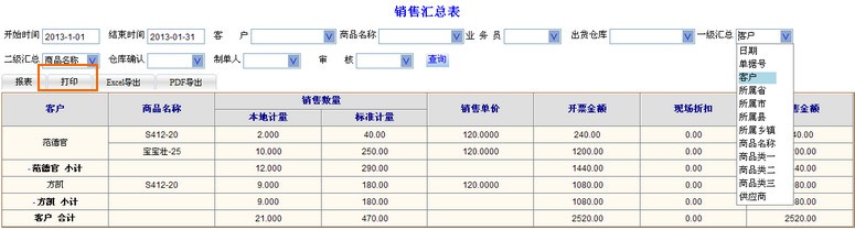 查询销售汇总表 · 打印销售汇总表 · Excel和PDF导出