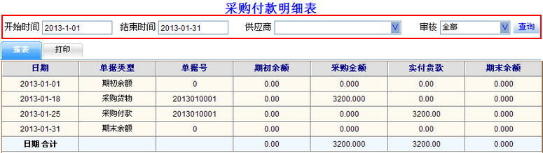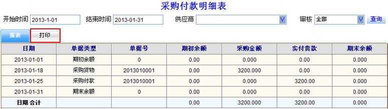 2 打印采购付款明细表: