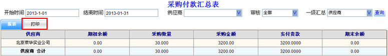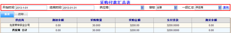 采购付款汇总表 此报表可以查询与供应商一段时间内发生的采购付款汇总统计记录,也可对某个所关心的供应商的采购业务进行查询,查看全部采购业务的付款情况。默认为当月的采购付款汇总信息,可以通过按日期、供应商、一级汇总和审核等条件查询。在进销财系统下,点击“采购管理”--“采购报表”--“采购付款汇总”菜单,可查看报表、打印。