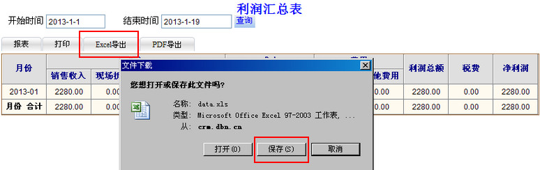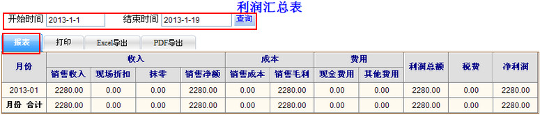 查看利润汇总表 · 打印利润汇总表 · Excel和PDF导出